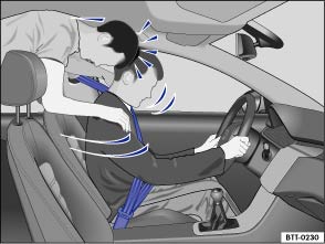 Even at low collision speeds, the forces acting on the body are too much for the body to be held in the seat with the arms and hands. In a frontal collision, unrestrained occupants will slam violently into the steering wheel, instrument panel, windshield or anything else in the way ⇒ Fig. 58 .