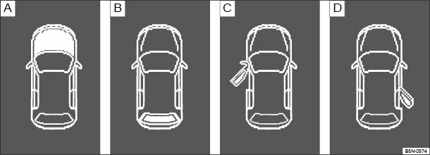 Fig. 13 In the instrument cluster display: A: Open engine hood, B: Open rear hatch, C: Open front driver side door, D: Open rear passenger side door.