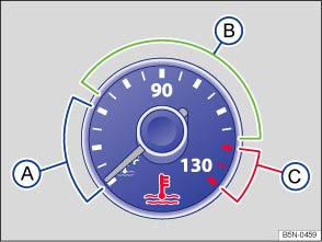 Fig. 163 Engine coolant temperature gauge in the instrument cluster: Ⓐ Engine cold; Ⓑ Normal temperature range; Ⓒ Warning zone.