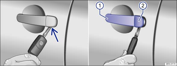 to the subject When locking the vehicle manually, all doors are locked. Keep the key turned in the locking position to close all windows and the power sunroof (convenience closing). When the vehicle is unlocked manually, only the driver door is unlocked. Keep the key turned in the unlocking position to open all windows. Note the instructions for the anti-theft alarm system ⇒ Anti-theft alarm system .