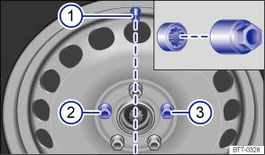 On a wheel with a wheel cover, the anti-theft wheel bolt must be installed at points ⇒ Fig. 193② or ③. Otherwise, the wheel cover cannot be installed.
