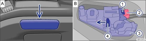 | 4. | Remove the red locking mechanism ⇒ Fig. 205② B as illustrated and disconnect the electrical connector with the lever pressed down ⇒ Fig. 205① B. |