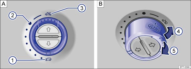 Fig. 34 In the headliner: Rotary switch for the power sunroof. (A) Turn the rotary switch to slide the sunroof open or closed. (B) Press or pull the switch to tilt open or to close.