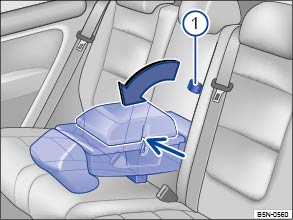 The cushion can be pulled off the center armrest from above to access the cup holders beneath it ⇒ Cup holders in the rear center armrest . When the cushion is replaced, the notch in the cushion must be on the left⇒ Fig. 50 (small arrow) and securely latched.